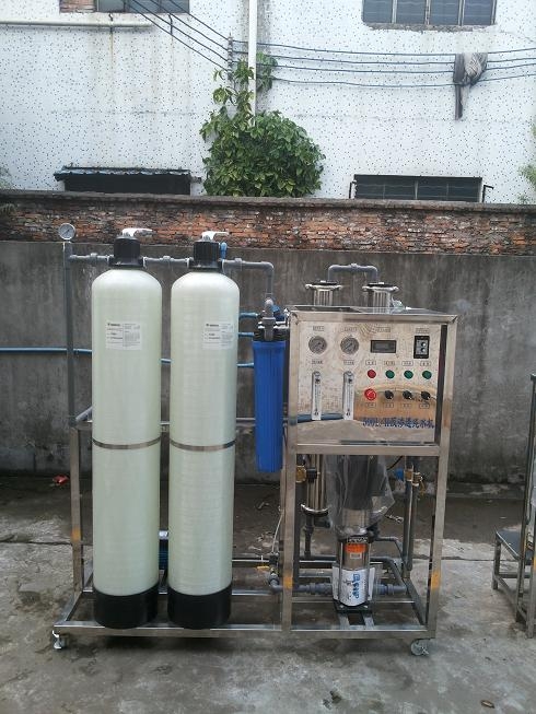 自来水或原水箱→原水加压泵→石英砂过滤器→活性碳过滤器→阳树脂软水器/阻垢剂(根据水质二选一或均不配)→保安过滤器→高压泵→反渗透膜组→纯水储罐(按需求配置)
