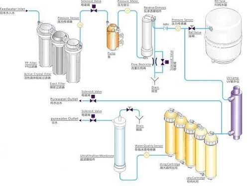 通常由原水预处理系统、反渗透纯化系统、超纯化后处理系统三部分组成。预处理的目的主要是使原水达到反渗透膜分离组件的进水要求,保证反渗透纯化系统的稳定运行。反渗透膜系统是一次性去除原水中98%以上离子、有机物及100%微生物(理论上)最经济高效的纯化方法。超纯化后处理系统通过多种集成技术进一步去除反渗透纯水中尚存的微量离子、有机物等杂质,以满足不同用途的最终水质指标要求。
