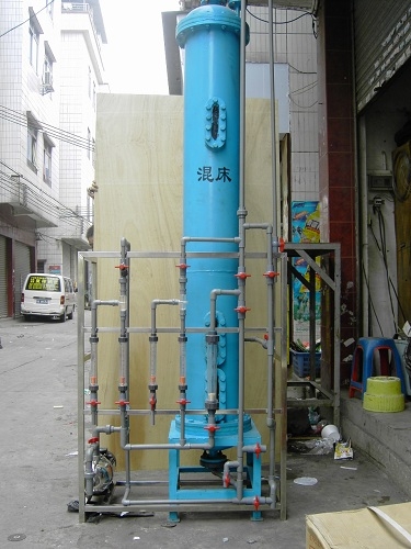 3、混合离子交换混床:混床是将阳、阴树脂按一定比例(一般为1:2)组合而成,由于通过混合离子交换柱后进入水中的H+和OH-立即生成电离度很小的水分子(H2O),故可以使交换反应进行得十分彻底,因而混合床的出水质优于阳、阴串联组成的复床所能达到的水质,能制取纯度相当高的成品水。